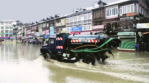 A city municipal corporation van passes through a waterlogged road in Srinagar on Sunday. (Source: PTI photo)
