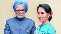 Manmohan Singh with Myanmar opposition leader Aung San Suu Kyi in Nay Pyi Taw on Tuesday. (PTI)
