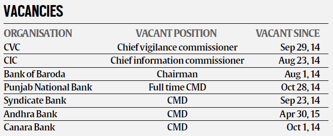 Even as the government has been talking of autonomy and professionalising bank managements and boards, it’s still a long road. Currently, as many as five public sector banks do not have a full-time CMD in place and the list includes — Punjab National Bank, Bank of Baroda, Syndicate Bank, Andhra Bank and Canara Bank. Two more posts will fall vacant in the next two months — Bank of India and IDBI Bank. But it’s not just banks. Even key institutions such as the CVC and CIC are also operating without a chief for over nine months now.
