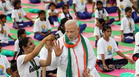 Soon after addressing the gathering, Modi climbed down from the podium to join over 35,000 participants to perform “asanas”.
