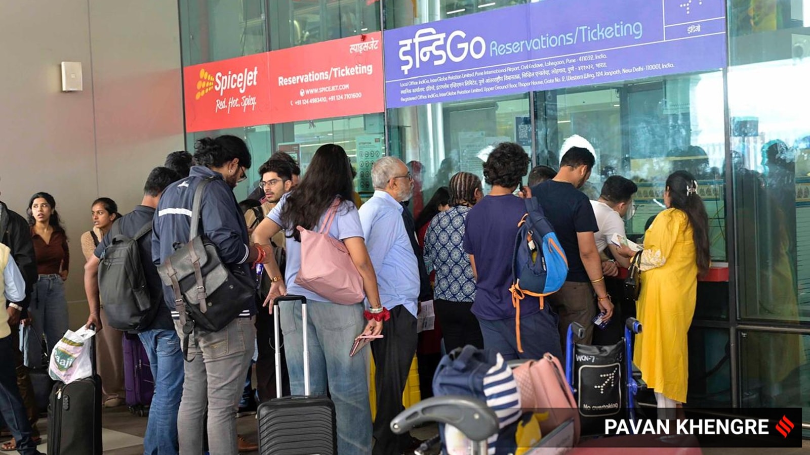 Passengers outside the IndiGo flight ticket counter at Pune International Airport. (Express Photo by Pavan Khengre)