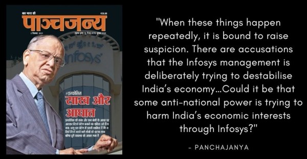 Responding to questions from The Indian Express, Panchajanya Editor Hitesh Shankar said: “The cover story is about a big corporate (Infosys) whose work’s quality is not up to its reputation. This not only hampers the company’s reputation but also causes inconvenience to crores of people…This kind of role and deliveries create dissatisfaction in society. If Infosys is not involved in socially questionable/propaganda funding, it must come out and state the facts…we are writing about the dissatisfaction that has arisen in the society. The company must clarify whether it is a software company or an instrument to engineer social anger.”