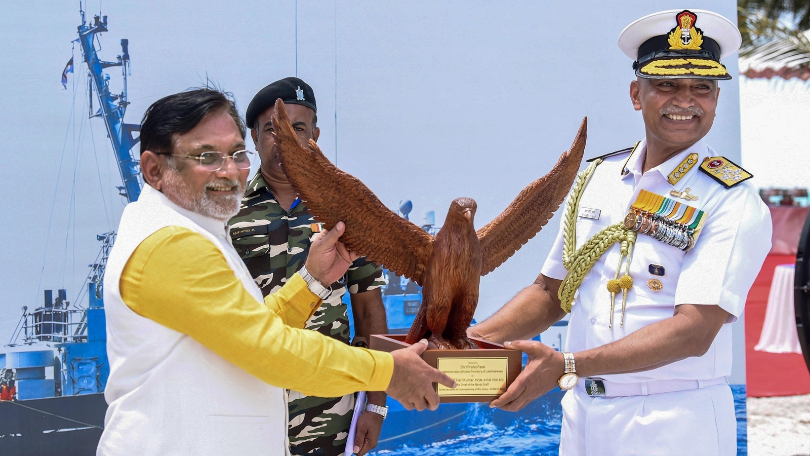 Chief of the Naval Staff Admiral R. Hari Kumar presents a memento to Lakshadweep Administrator Praful Khoda Patel during the commissioning of naval base 'INS Jatayu', in Minicoy, Lakshadweep Islands, Wednesday, March 6, 2024. (PTI Photo)