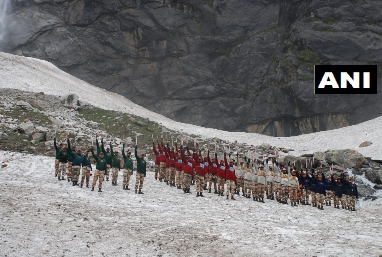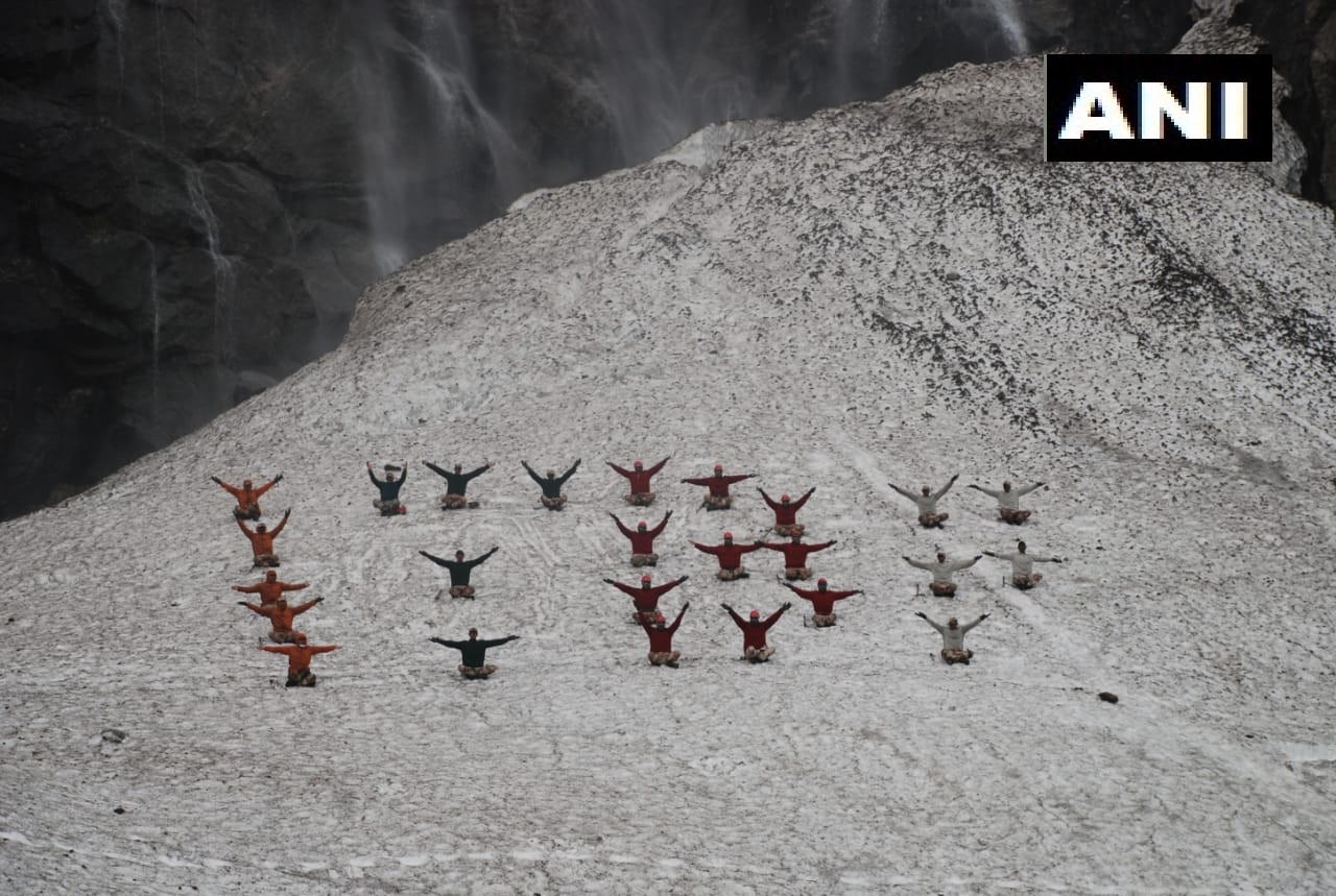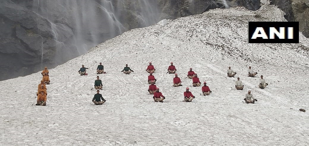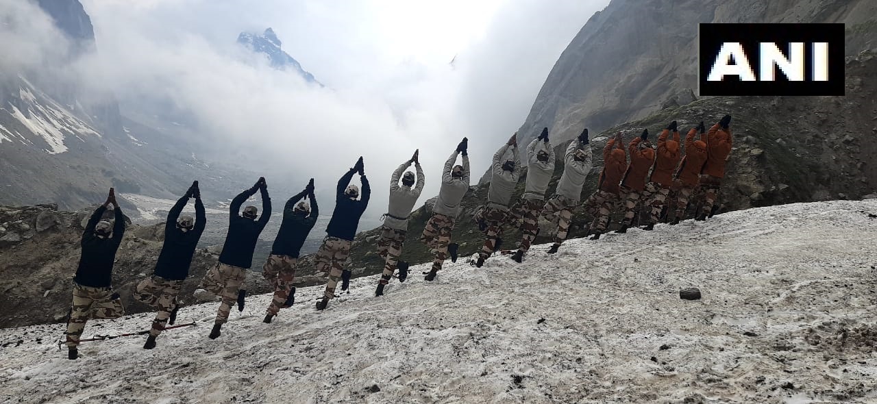 Indo-Tibetan Border Police (ITBP) personnel, deployed at India-China border, perform Yoga at an altitude of 14,000 feet at Vasudhara glacier near Badrinath on occasion of International Yoga Day. (Picture source: ANI)