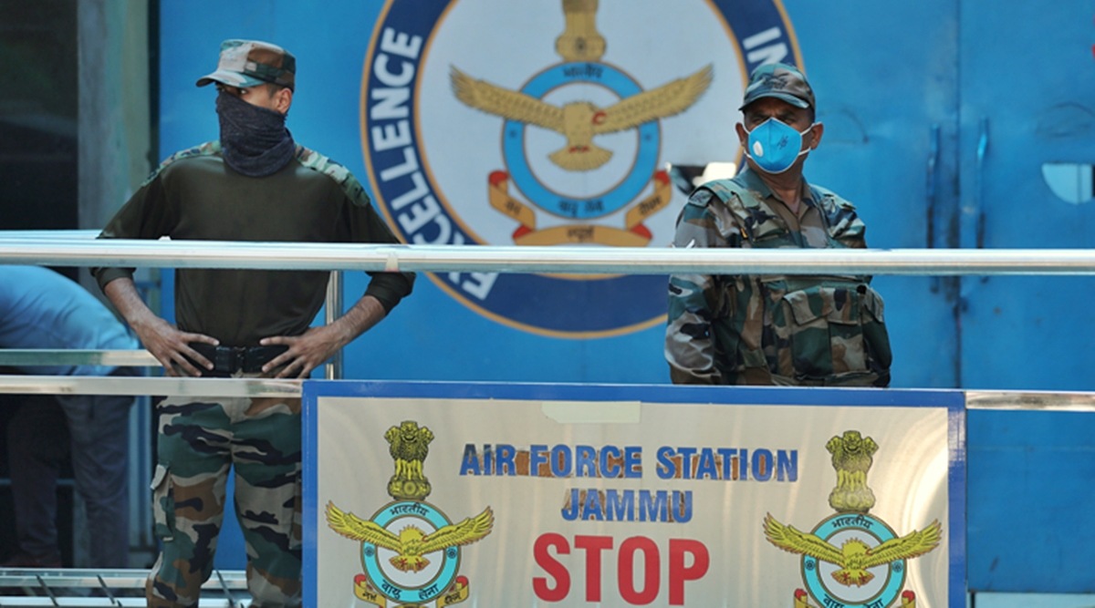 Jammu: Security personnel stand guard outside IAF station in Jammu, Tuesday, June 29, 2021, which was bombed on early hours of Sunday by Pakistan based terrorists by a drone. The NIA took over the investigation of the case. (PTI)(PTI06_29_2021_000076A)