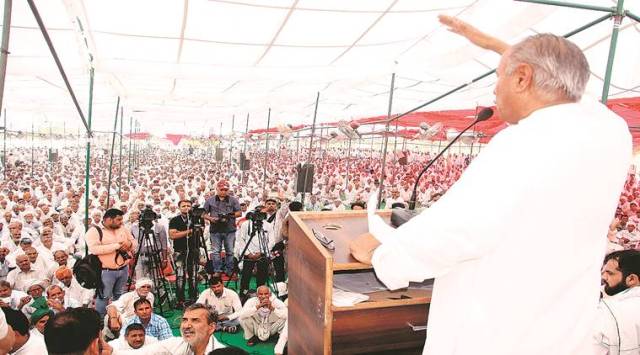 AIJASS chief Yashpal Malik addresses a rally in a Rohtak village Saturday. (Express photo)