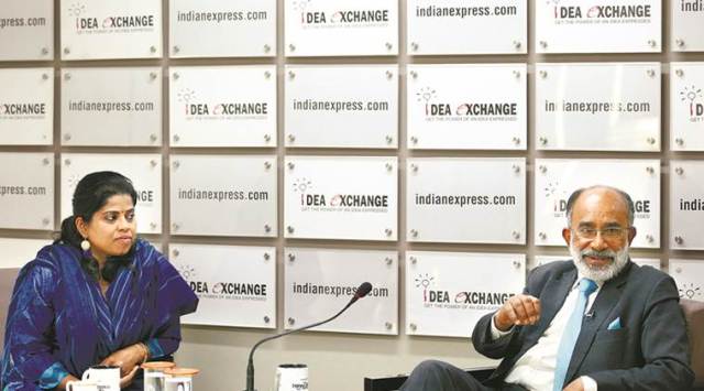 Union minister K J Alphons with Associate Editor Liz Mathew in The Indian Express newsroom. (Express Photo/Amit Mehra)
