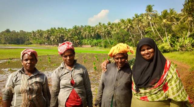 Yasmin (right) with farmers in Thennala, Malappuram. (Express photo)