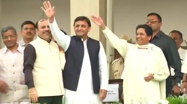 BSP supremo Mayawati is the next Opposition leader to join Akhilesh Yadav on stage. They warmly exchange pleasantries. They were then joined by former JD(U) leader Sharad Yadav.