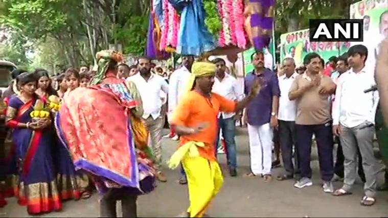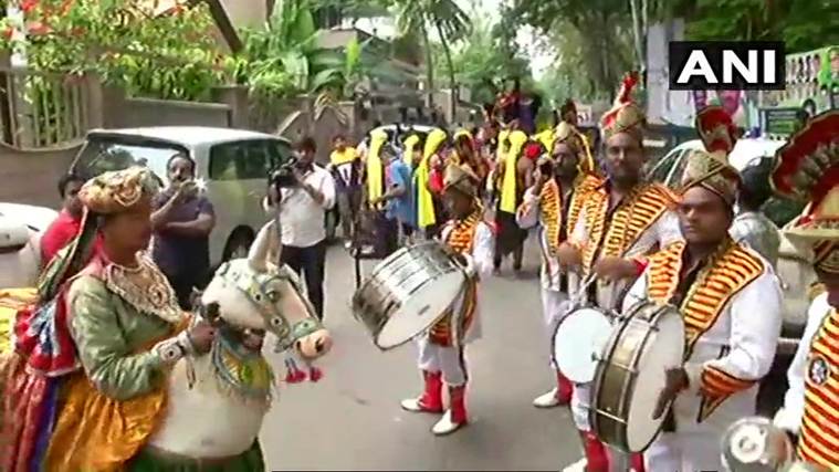Visuals of celebrations from outside HD Kumaraswamy's residence in Bengaluru. (ANI photo)
