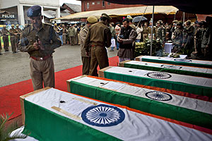 The funeral ceremony for the five CRPF jawans killed in the Srinagar attack by militants turned into a controversy today as Jammu and Kashmir Chief Minister Omar Abdullah absented himself from the proceedings,an act that infuriated the rank and file. Loud calls of 'Where is Omar Abdullah' were made as the jawans coffins,wrapped in the tri-colour,were carried through the streets by their grieving comrades. However,no untoward incident happened thereafter as both discipline and quiet were gradually restored. Two militants and five CRPF jawans were killed and 11 other seven CRPF personnel and four civilians were injured in the suicide attack on their camp on Wednesday. Two militants are reported to managed to have escaped from the area successfully. Curfew has been clamped down on Srinagar and security forces' presence on the street has been raised considerably Last respects paid to CRPF jawans killed in Srinagar attack CRPF and police officers today bid a tearful adieu to their colleagues who were killed in a militant attack on a security forces camp in Bemina area of the city. Director General of CRPF Pranay Sahay and DGP of Jammu and Kashmir Police Ashok Prasad led the officers and jawans of the two forces in paying floral tributes to the five CRPF personnel who were killed in the firing yesterday. Sahay and Prasad laid floral wreaths on the coffins of the jawans before they were flown to their respective native places. Those killed in the militant attack are Assistant Sub-Inspector A B Singh,constables Om Prakash,L Parmol,Subhash and Satish Shah. Meanwhile,IG CRPF,Kashmir,V S Yadav dismissed suggestions that the CRPF men were unarmed when the attack took place. "We have a standard operating procedure and that was followed. One-third of the jawans of the concerned (CRPF) company were armed,one third were carrying the riot gear and one-third had lathis," Yadav said. Abdullah later drove to the airport and laid wreaths on the coffins of the five jawans before the bodies were airlifted to Delhi to be taken to their home towns. Union Minister of State for Home RPN Singh received the bodies at the Palam airport. With PTI inputs