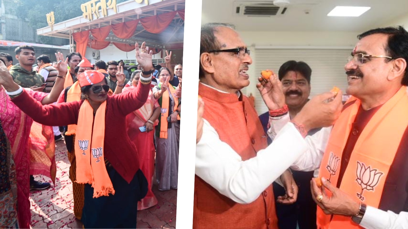 Election Results in Madhya Pradesh: CM Shivraj Singh Chauhan and BJP party state in-charge V D Sharma exchange sweets (right) as party workers celebrate the election results on December 3, 2024. (Facebook/BJP Madhya Pradesh)Madhya Pradesh Assembly Election Result 2023 Highlights (December 3): The ruling Bharatiya Janata Party (BJP) recorded a landslide victory in Madhya Pradesh today, winning 163 seats in the 230-seat Assembly. Congress was contained to 66 constituencies while the Bharat Adivasi Party registered its first victory in the state polls, with its candidate Kamleshwar Dodiyar winning from the Sailana Assembly seat.