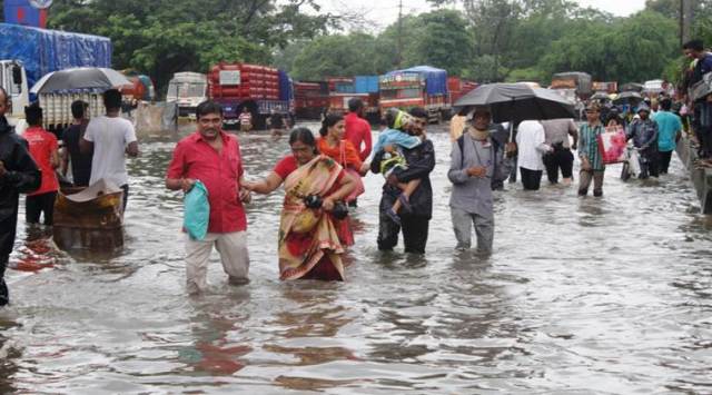 People wade through waterlogged roads. (Express photo by Deepak Joshi)