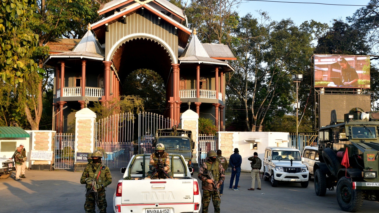Paramilitary troopers stand guard outside the Kangla Fort in Imphal, Manipur, India, January 23, 2024. REUTERS/Stringer