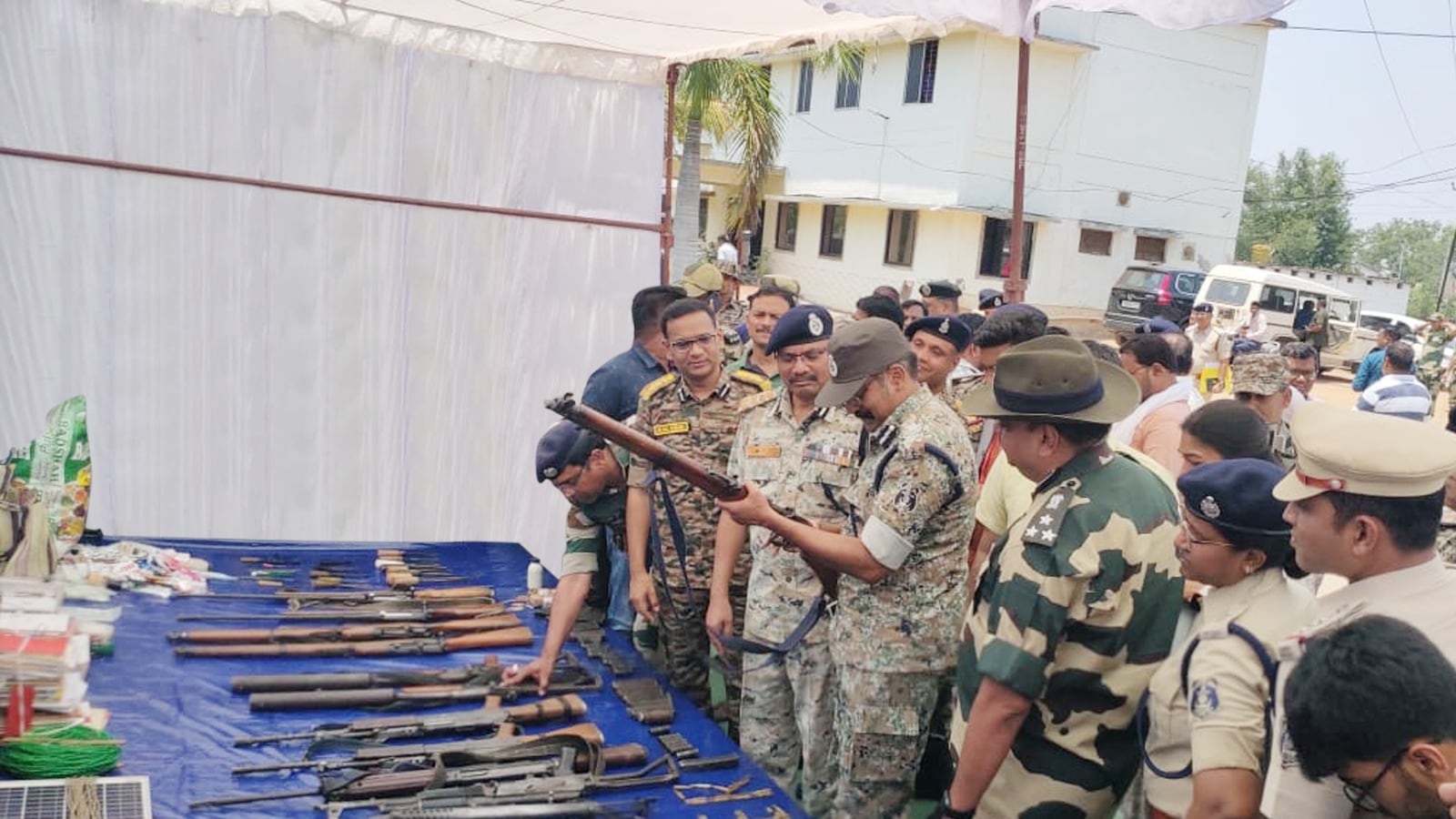 Bastar IG Sundarraj P and others check the weapons seized after the encounter in Kanker, on Wednesday. (PTI)
