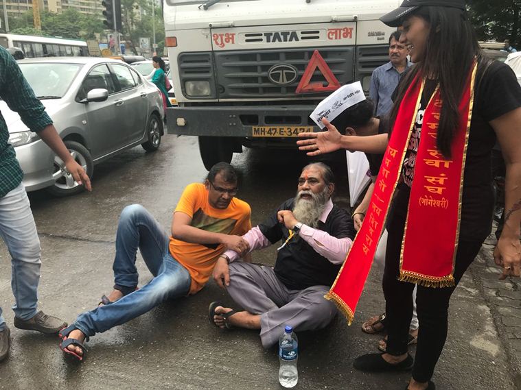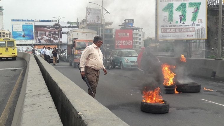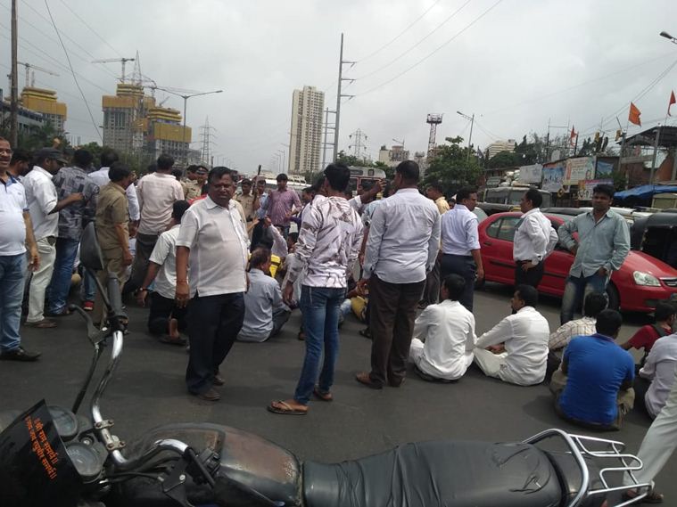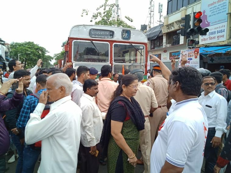 Protesters are not allowing buses to ply outside Thane depot. They are also trying to block vehicular movement at western express highway (Express Photo)