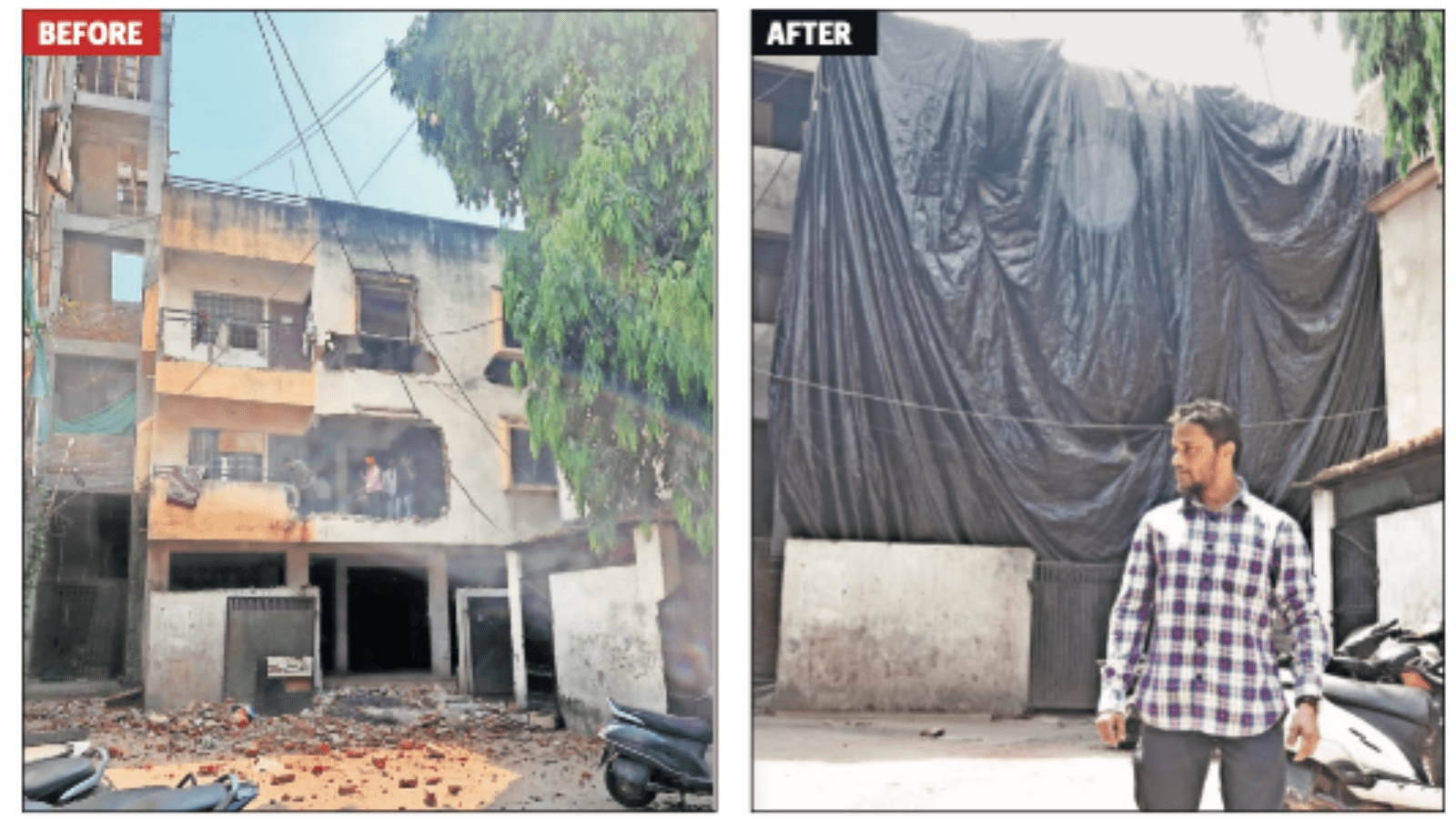 A large black sheet covers the front of Mohammad Ebad’s house near Gandhi Gate. Behind it, where a wall once stood, is the portion demolished by civic authorities after the riots. Nearly 24 members of his extended family, including his 96-year-old father and 86-year-old mother, continue to live inside. The house stands neither intact nor demolished — a structure frozen mid-action.