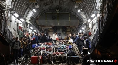 Students who have been evacuated from Ukraine deboard an IAF aircraft at the Hindon Airbase in Ghaziabad. (Express Photo: Praveen Khanna)