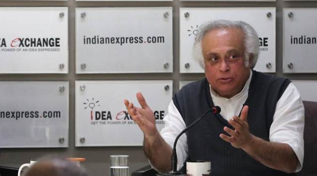 Congress leader Jairam Ramesh during the Idea Exchange at Noida Office on Saturday. (Express Photo by Renuka Puri)