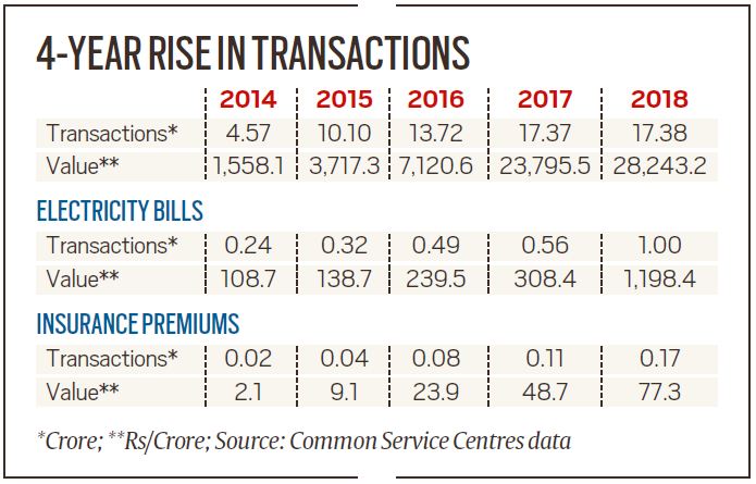 The total value of CSC transactions that include banking, PAN and passport applications, insurance policies, IRCTC tickets, air and bus purchases, electricity and water bills and mobile recharges since 2014 is Rs 64,400 crore. Data also show a four-fold increase in the number of transactions through CSCs since 2014.