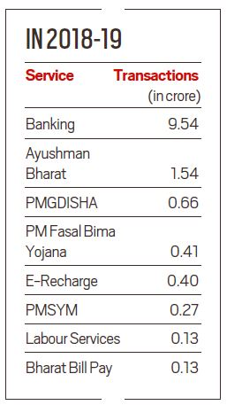 Over the last five years, CSC’s have been used mostly for banking services, but the next largest transaction group with almost three crore payments, mobile e-recharges, has dipped by more than half in the past two years, giving way to electricity bill payments.