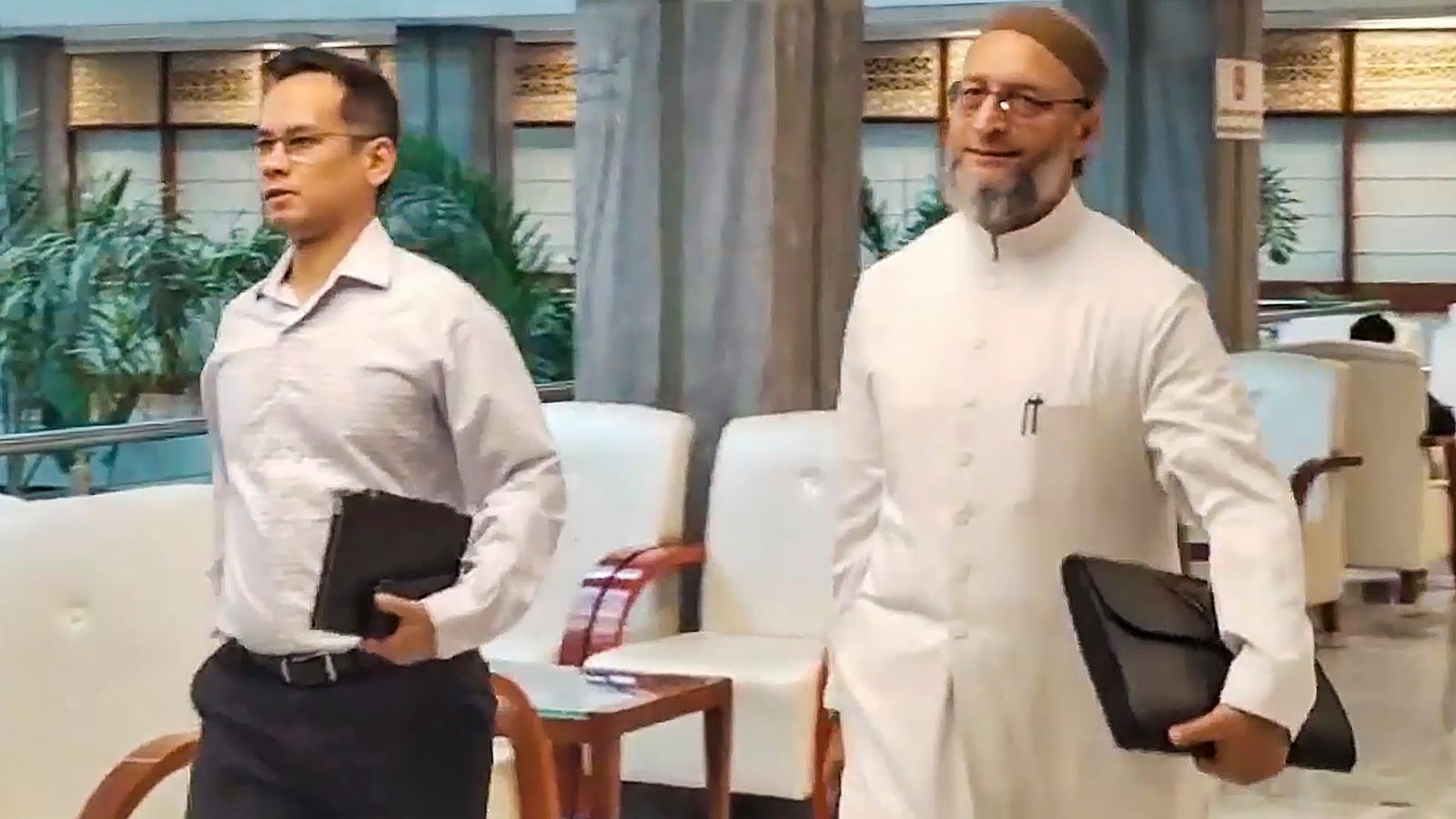 AIMIM MP Asaduddin Owaisi and Congress MP Gaurav Gogoi at the Joint Parliamentary Committee meeting on the Waqf (Amendment) Bill. (Screengrab/PTI)