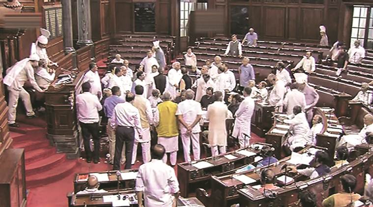 Members protest in the Well in Rajya Sabha on Monday. (PTI)