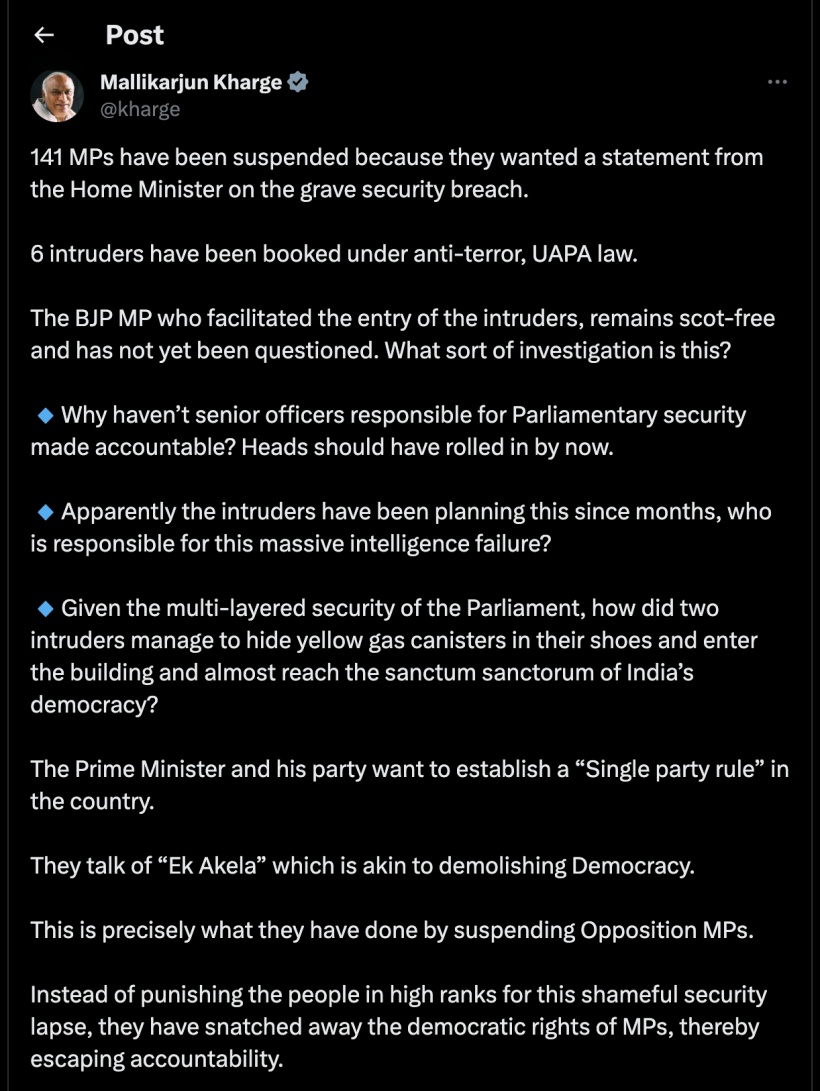 "141 MPs have been suspended because they wanted a statement from the Home Minister on the grave security breach. 6 intruders have been booked under anti-terror, UAPA law. The BJP MP who facilitated the entry of the intruders, remains scot-free and has not yet been questioned. What sort of investigation is this? " he wrote on X.