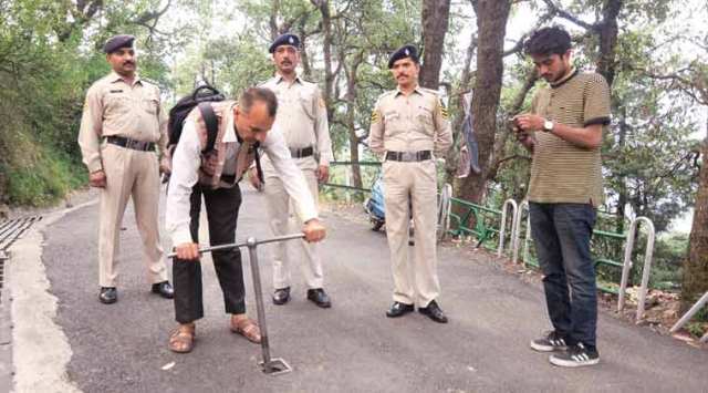 Hari Ram at work, flanked by policemen and supervised by nodal officer Rakesh Thakur in Shimla. (Photo: Pradeep Kumar)
