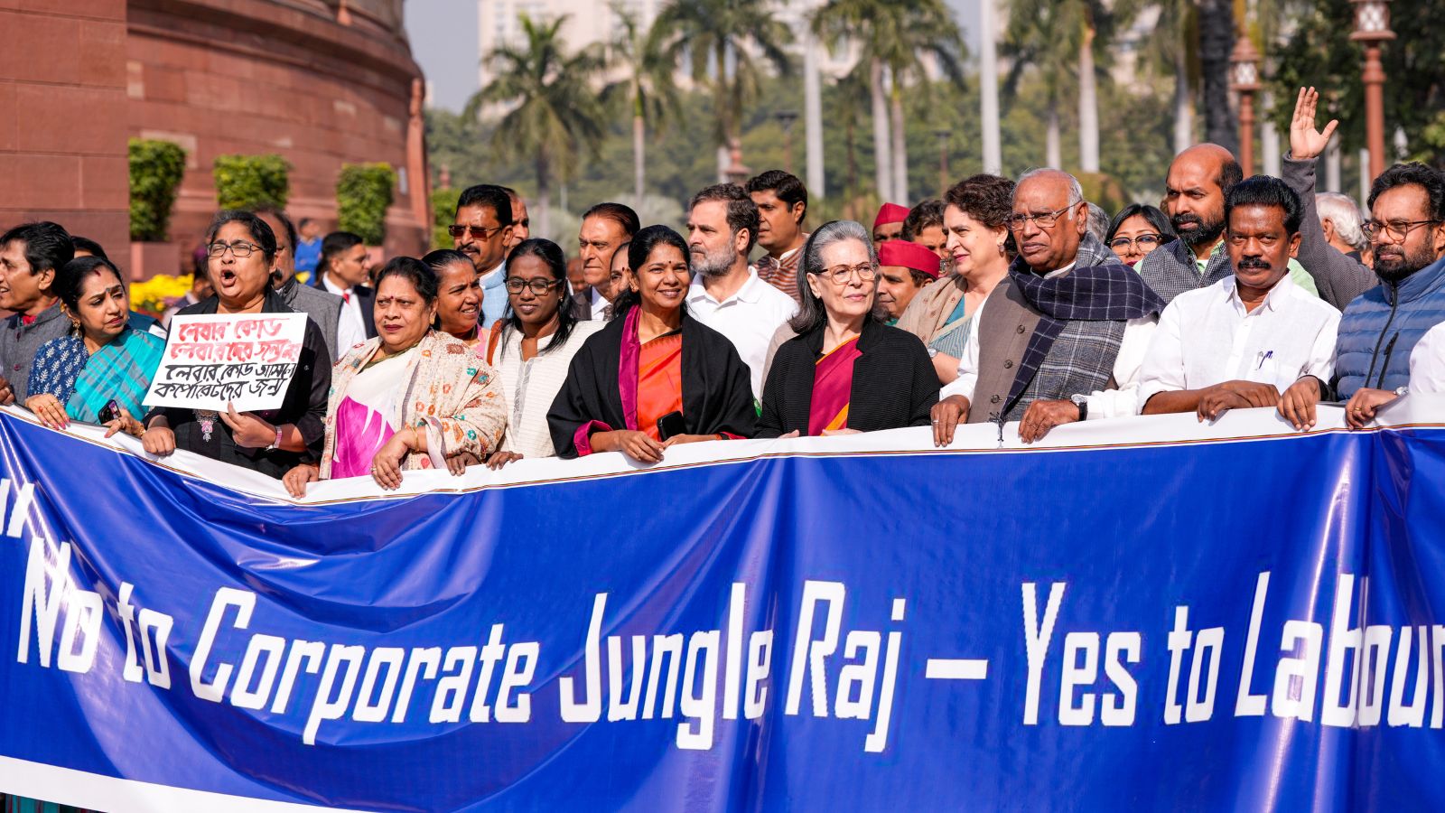 The MPs held a large banner which read: ‘No to Corporate Jungle Raj, Yes to Labour Justice’.
