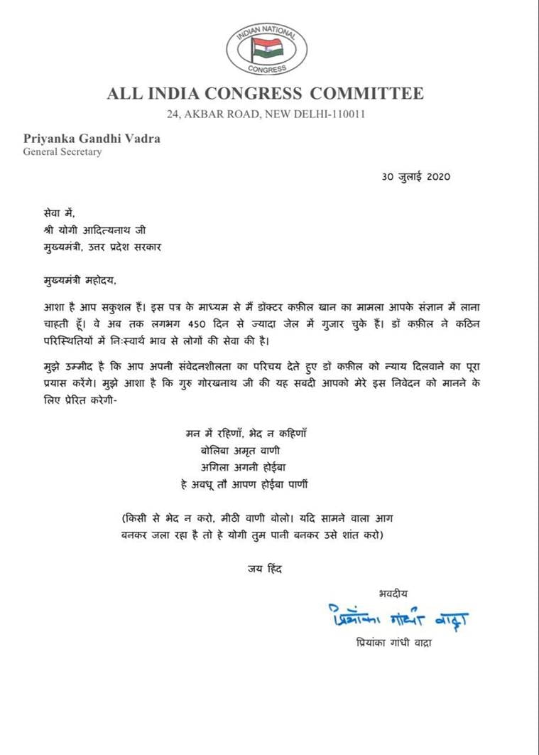 Congress general secretary Priyanka Gandhi Thursday sought justice for Dr Kafeel Khan who is in detention for allegedly making an inflammatory speech on the Aligarh Muslim University campus during the anti-Citizenship Amendment Act (CAA) protests. He was booked under the National Security Act (NSA) over alleged hate speech.