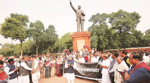OPPOSITION PARTIES, joined by the Shiv Sena, on Tuesday boycotted a joint sitting of Parliament on the occasion of the 70th Constitution Day to protest against the political developments in Maharashtra. Hitting out at Prime Minister Narendra Modi, who hailed the Constitution, his predecessor Manmohan Singh said “the proof of the pudding is in the eating”. Opposition members led by Congress president Sonia Gandhi and Singh gathered at the B R Ambedkar statue at Parliament House and read in various languages parts of the Constitution for over 90 minutes. Sonia read out the Preamble of the Constitution, while Singh read Article 14 of the Constitution — right to equality. When asked about the Prime Minister’s hailing the Constitution, Singh told reporters, “Well, I think the proof of the pudding is in the eating. The way the Central government has behaved in Maharashtra, it is not certain that constitutional norms are safe in the hands of present establishment.” Hitting out at the government, former Congress president Rahul Gandhi said: “It is ironic that on the day India is celebrating its Constitution, the BJP government is busy working to destroy it. The Constitution belongs to every Indian. Let us pledge to uphold its values & defend it at all costs.” Among the parties that boycotted the joint session and participated in the protest were Congress, Trinamool Congress, DMK, Shiv Sena, RJD, CPI, CPI(M), SP, BSP, JD(S), RSP and IUML. There were minor aberrations — Trinamool member Nusrat Jahan attended the Central Hall event, apparently because the party’s instructions were not clear to her, while BJP’s Khagen Murmu spent several minutes at the Ambedkar statue, mistaking the opposition demonstration for a gathering to pay homage to Ambedkar on Constitution Day. Some parties such as AAP stayed away from the demonstration at the Ambedkar statue, but joined the boycott of the Central Hall event. Sources said the opposition plan to boycott the Central Hall function and instead assemble at the Ambedkar statue had been formed by Monday afternoon. Opposition members came armed with copies of the Constitution, while some downloaded regional language versions on their phones after having failed to procure them from bookshops in Central Delhi. “It was a collective coordinated effort. Parts of the Constitution, various Articles, the Preamble were read out in different languages - English, Hindi, Urdu, Bengali, Malayalam etc,” said TMC Rajya Sabha leader Derek O'Brien.