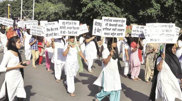 At a protest in Chandigarh against desecration of the Guru Granth Sahib. Express file photo