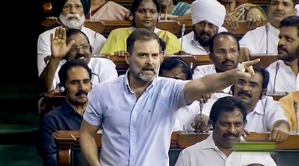 Congress MP Rahul Gandhi speaks on the Motion of No-Confidence in the Lok Sabha during the Monsoon session of Parliament, in New Delhi, Wednesday, Aug. 9, 2023. (PTI Photo)