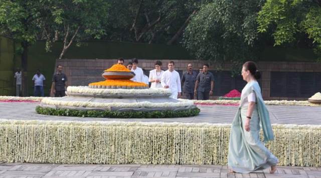 Congress interim president Sonia Gandhi, former Vice President of India Hamid Ansari, former President Pranab Mukherjee and former Prime Minister Manmohan Singh at Vir Bhoomi, New Delhi, on Monday. (Express Photo: Prem Nath Pandey)