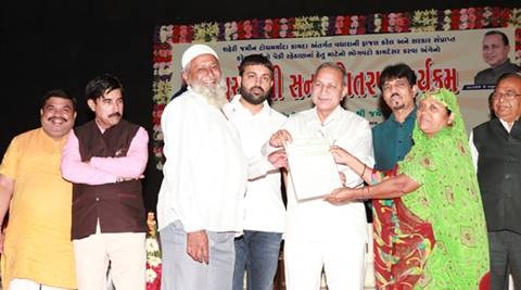 Minister Babu Bokhiria hands over land title to a beneficiary as Minister Jayesh Radadiya looks on, in Rajkot on Friday. Express photo