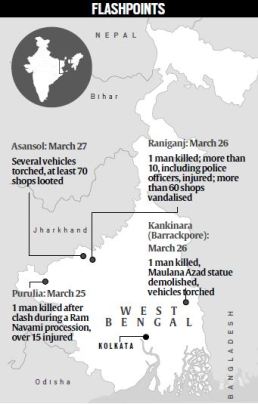 Three people were killed and nearly two dozen injured in clashes during Ram Navami processions at various places in West Bengal, including Purulia, Murshidabad, West Bardhman, Asansol and Raniganj. On Tuesday, Union minister and BJP’s Asansol MP Babul Supriyo had apprised Home Minister Rajnath Singh about the Raniganj violence and requested him to send central paramilitary forces.
