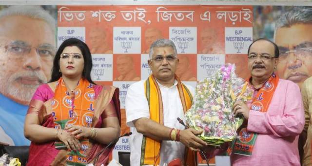 Baisakhi Banerjee and Sovan Chatterjee with West Bengal state president Dilip Ghosh. (Express Photo by Partha Paul)