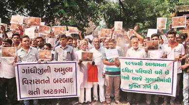 The protesters included the five families who claim to be descendants of cobblers called to the Sabarmati Ashram by Gandhi to make ‘ahimsa chappals’, and who were issued eviction notices by the ashram’s Gaushala Trust in 1978. On August 29 this year, the Gujarat High Court granted them relief and stayed the eviction.
