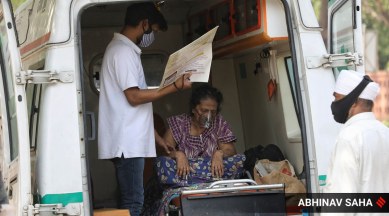 A Covid-19 patient waits in ambulance for admission at Sri Guru Tegh Bahadur Covid Care Center, in New Delhi. (Express Photo: Abhinav Saha)