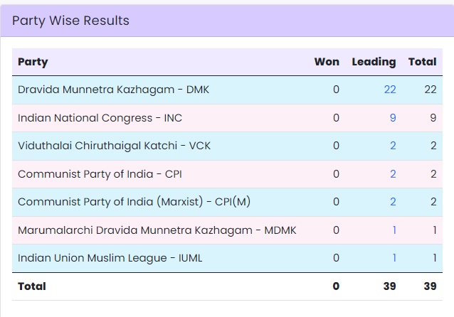 Tamil Nadu Lok Sabha Election Results Live: Tamil Nadu Chief Minister and Dravida Munnetra Kazhagam (DMK) supremo M K Stalin met Telugu Desam Party (TDP) chief N Chandrababu Naidu at the Delhi airport as the two returned from the INDIA and the NDA meetings respectively. Posting photos of the two, Stalin wrote on X: 'Met Thiru Chandrababu Naidu garu, a longtime friend of Thalaivar Kalaignar, at Delhi Airport. I conveyed my best wishes to him and expressed hope that we will collaborate to strengthen the ties between the brotherly states of Tamil Nadu and Andhra Pradesh. I am confident that he will play a crucial role in the Union Government, advocating for the southern states and protecting our rights.' Tamil Nadu Chief Minister M K Stalin-led Dravida Munnetra Kazhagam swept Lok Sabha election by winning 39 out of 39 seats in the state and the lone seat in Puducherry. The thumping victory comes as a blow to the BJP and its state chief K Annamalai who led a fierce campaign in the state. Conceding defeat, Annamalai who secured over 4 lakh votes in Coimbatore, wrote in a post on X, "I bow down to the people of the Coimbatore Parliamentary constituency & thank the 4.5 Lakh voters who bestowed their faith in NDA & @BJP4TamilNadu. You believed in the vision of our Hon PM Shri @narendramodiavl for his Viksit Bharat. You have given us historic votes in the history of Coimbatore PC for NDA, and still, we were short of the winning mark. Not only DMK and its allies Congress, CPI, CPI(M), VCK, MDMK and IUML made a clean sweep, but its candidates - Kanimozhi, Dayanidhi Maran, T R Baalu, among others also won by huge margins in their constituencies. Even in Coimbatore and Dharmapuri constituencies, where BJP and PMK were expected to give a tough fight, DMK emerged victorious comfortably.