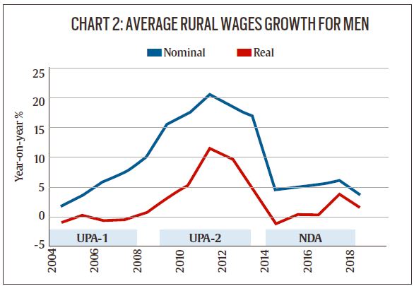 Chart 2 shows the annual growth in average daily wage rates in rural India for men over the last 15 years, both in nominal and real terms after netting out CPI inflation for rural labourers. Here, the trend is quite interesting.