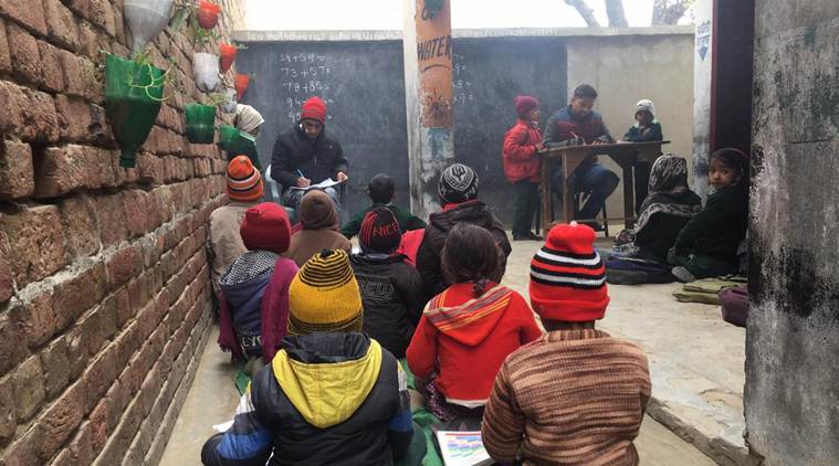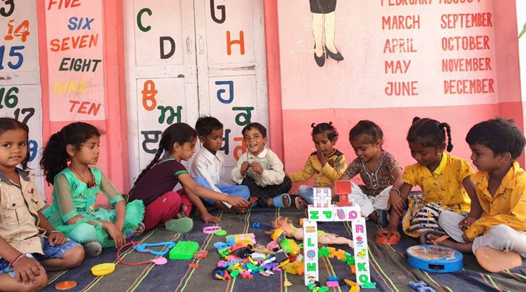 At a government pre-primary class in Punjab, kids sit on the rags because there isn’t provision of furniture for them. (Express Photo)