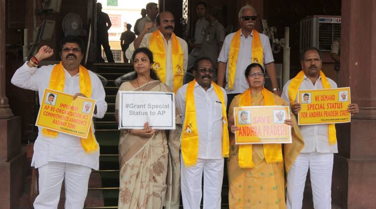 Telugu Desam Party MPs continue to stage a protest demanding special status for the state of Andhra Pradesh, during the Monsoon session of Parliament.
