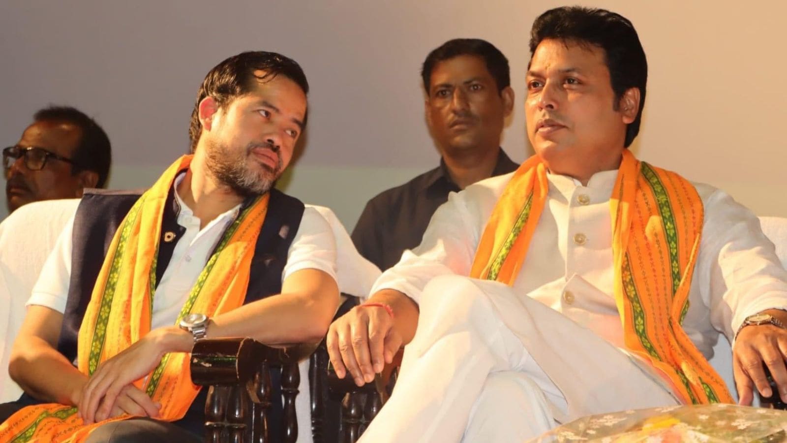 The former Tripura CM (right) also asked the employees to work for the country. (X/@BjpBiplab)