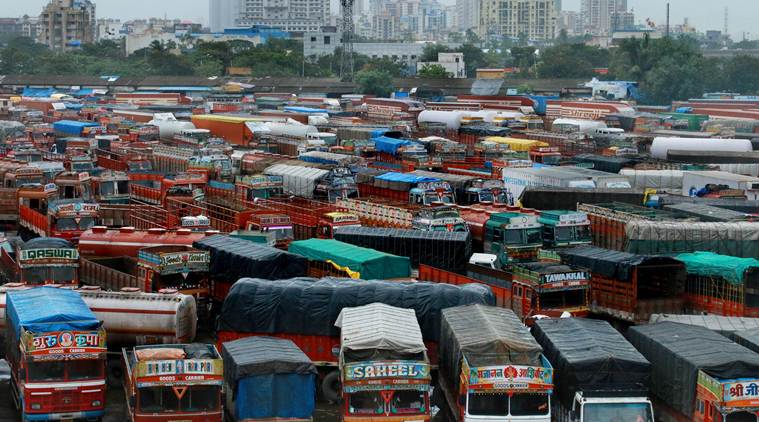 Transport owners staged a protest during the strike called by the All Indian Motor Transport Congress, in Navi Mumbai. Truck owners and operators are demanding for a reduction in central and state taxes by getting diesel under the GST so that price of the deregulated commodity can be reduced.