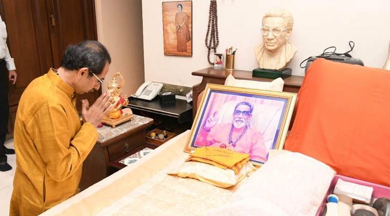 Uddhav Thackeray pays obeisance to his father after being named the CM candidate. (Express photo)