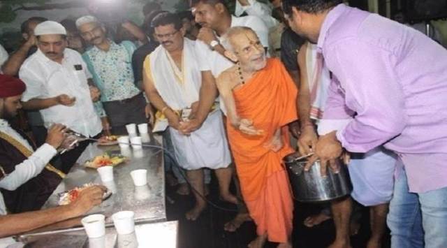Vishwesha Tirtha Swami of Paryaya Pejawar Mutt serving dates to Muslims in Udupi on Saturday. (Source: The News Minute)