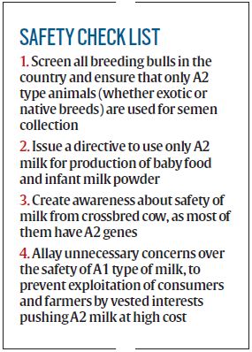 Since the EFSA’s report’s release in 2009, the controversy regarding A1 milk has almost ended globally. But in India, certain lobbies are continuing to keep this issue burning. People in Europe and the US have been consuming A1 milk for centuries, just as we in India have been drinking crossbred cow milk for over 50 years without any adverse effects being recorded. The Indian Council of Agricultural Research has commissioned a study to investigate the health safety aspects of milk from crossbred cows through animal feeding trials, the results of which are yet to come. The government should till then take a neutral stand on the issue of A1 and A2 milk. However, given that A1 milk releases BCM-7, which has a mild sedative effect, a strategy may be adopted purely as a precautionary measure.