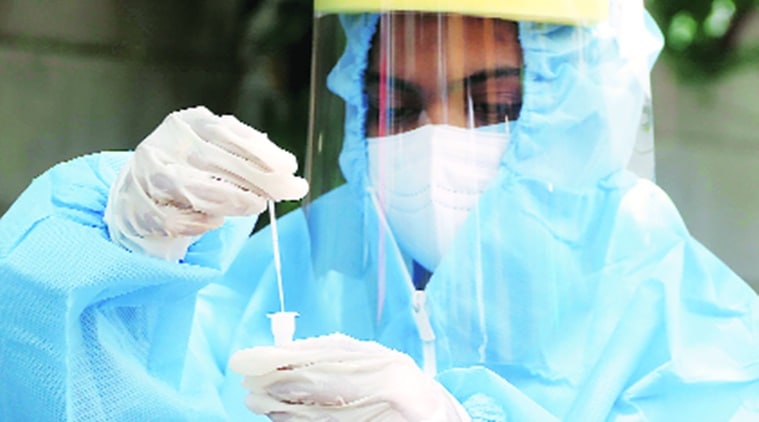 A health official examines a Covid sample at Ambawadi health centre in Ahmedabad on Tuesday. (Photo by Javed Raja)